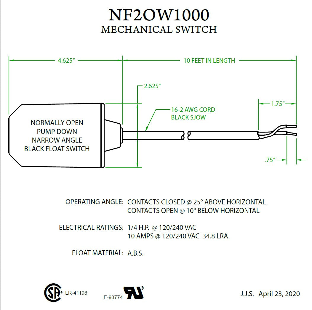 Pilot Duty | Control Float Switch - 10 Foot - Normally Open - Narrow Angle