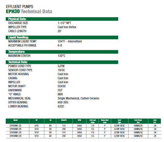 EPH30 3/10 horsepower Heavy-duty cast iron construction Oil-filled continuous duty PSC motor Upper and lower ball bearing construction Cast iron vortex impeller 3/4″ solids handling Please Note: When replacing a pump, the pump float must also be...Regular price $320.00Regular price $320.00